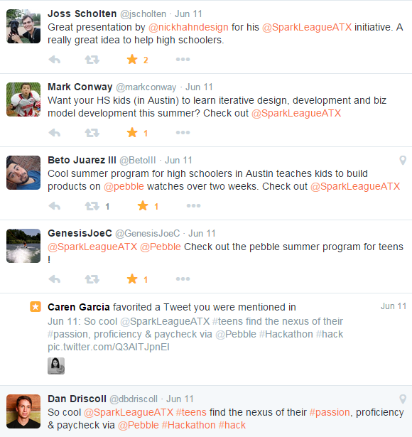 The following day, Nick Hahn, one of the cofounders, presented at a Texas Alliance for Computer Science Education (TACSE) meetup to introduce Austin Spark League to area educators. And since our students will be learning to code on Pebble’s mobile platform, Nick also appeared at a Wearable Tech meetup the next day to talk about our program, which generated quite a bit of buzz on Twitter.
